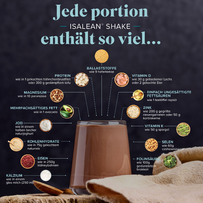1× IsaLean Shake (Whey) als Mahlzeit (z. B. Mittag oder Abend)