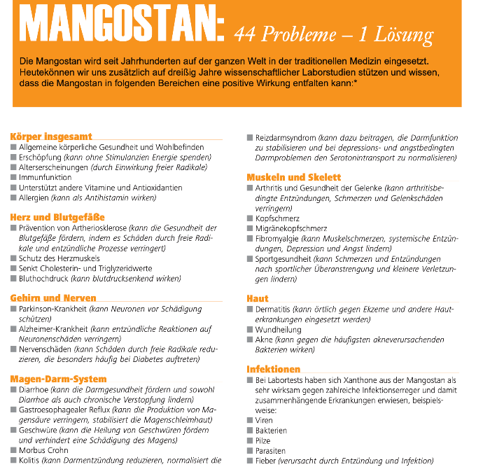 Kurztext: Broschüre mit allgemeinen Thesen zur Mangostan (ext. Quelle).